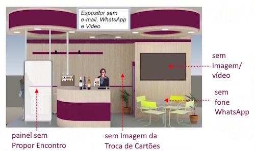 OBS 2- O Expositor poderá propor outras opções como clicar as garrafas para obter o Catálogo de Produtos. Com alguma frequência, o Visitante poderá explorar a disponibilidade de outras Utilidades apontando/ clicando elementos do Estande. Para dúvidas ou sugestões, contate o WhatsApp 21 9 7304 0655. |